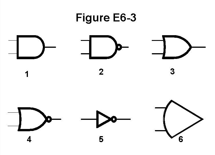 Figure E6-3 displays schematic symbols for digital logic functions. The NOT operation, or inverter, is the simplest of the gates, as it only has one input and one output, and its function is simply to reverse the input logic state (a ‘1’ becomes a ‘0’, and a ‘0’ becomes a ‘1’).